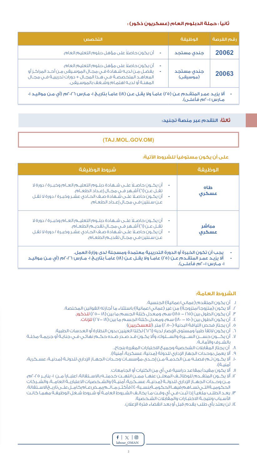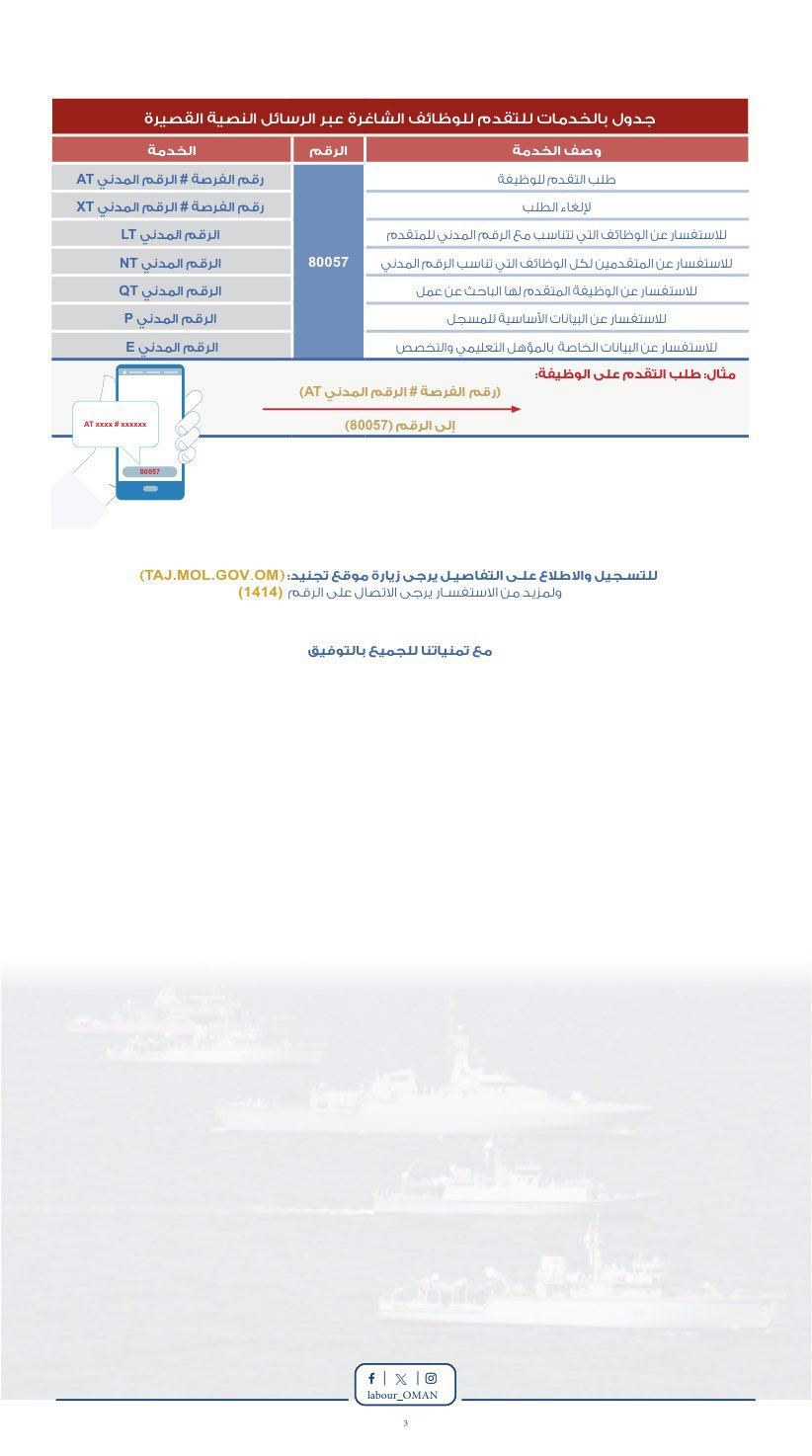 أعلنت وزارة العمل بالتنسيق مع البحرية السلطانية عن فتح باب التجنيد لعدد من الوظائف الشاغرة وللمزيد من التفاصيل والتسجيل أنقر هنا