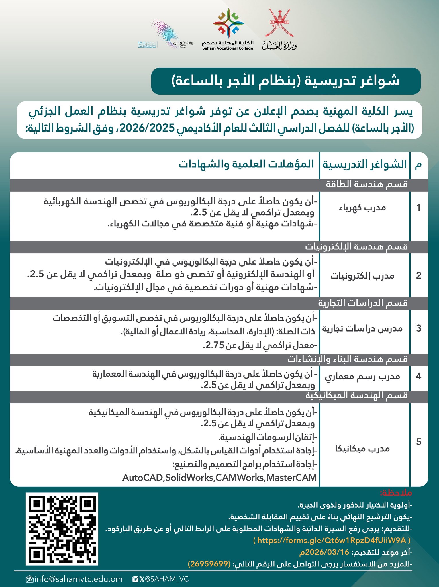 أعلنت الكلية المهنية بصحم عن توفر شواغر تدريسية بنظام العمل الجزئي (الأجر بالساعات) للفصل الدراسي الثالث للعام الأكاديمي 2025 / 2026م، وذلك وفق الشروط المحددة لكل قسم، وسيتم الترشيح النهائي بناءً على تقييم المقابلة الشخصية.