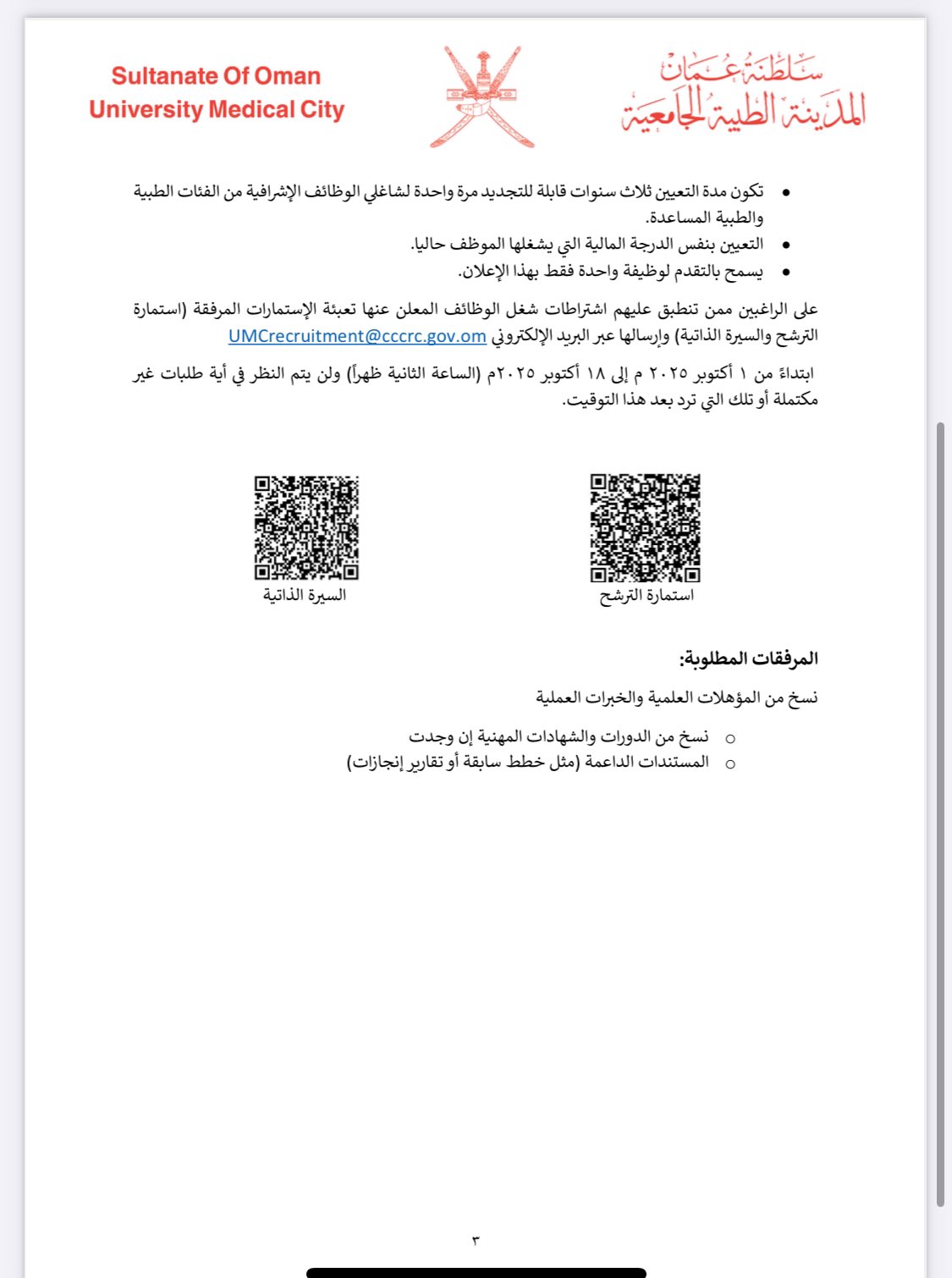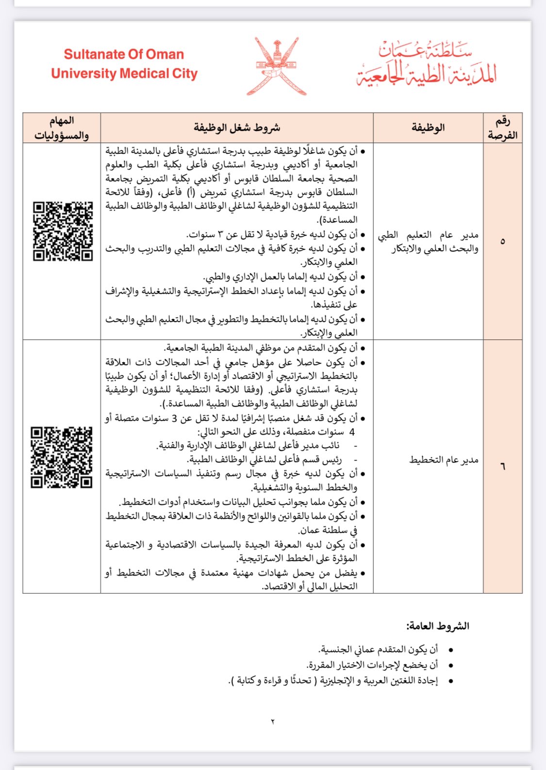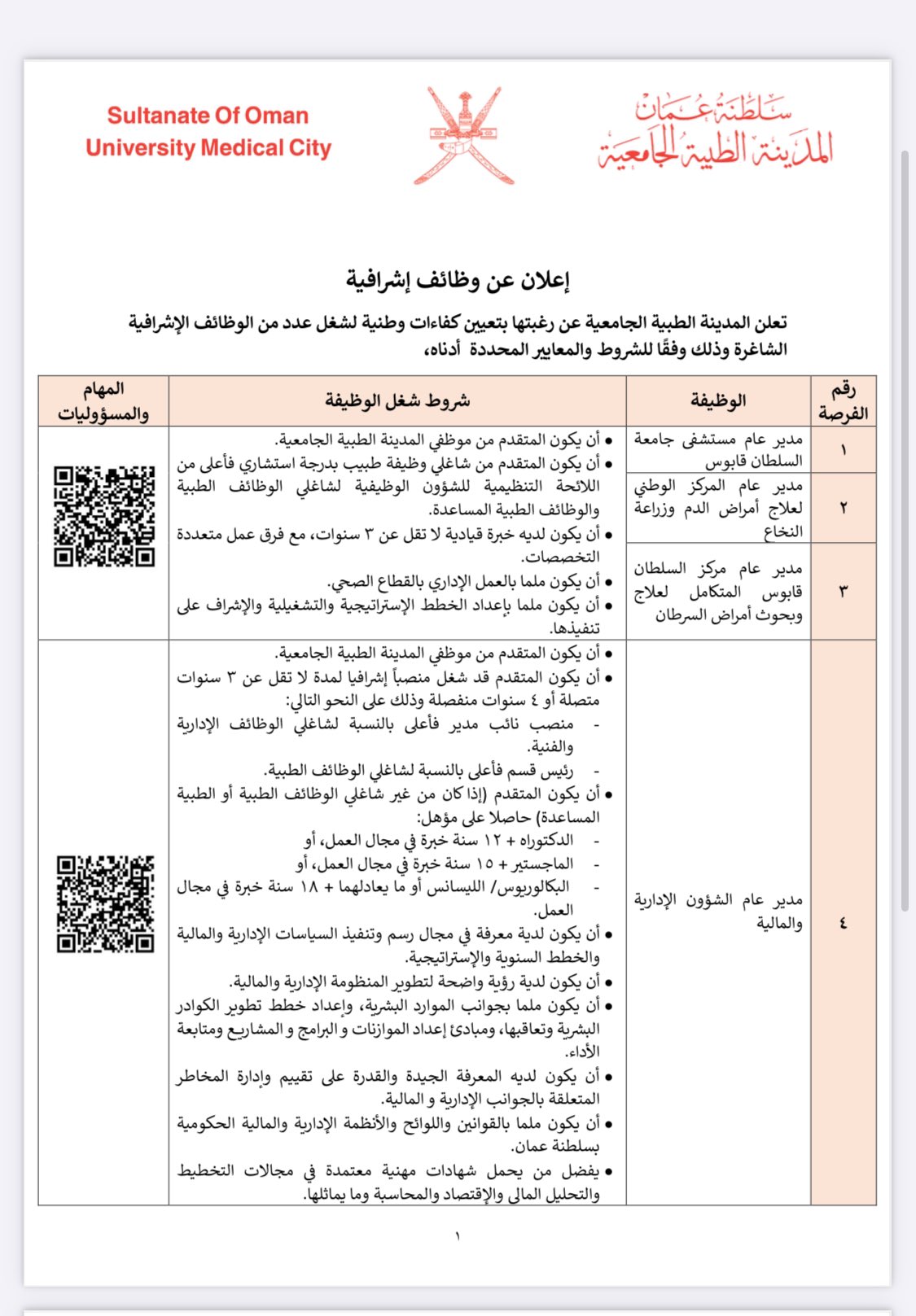 أعلنت المدينة الطبية الجامعية عن رغبتها بتعيين كفاءات وطنية لشغل عدد من الوظائف الإشرافية الشاغرة وللاطلاع على هذه الوظائف والشروط والمعايير المحددة يرجى مسح رابط الاستجابة أدناه أنقر هنا عبر الرابط