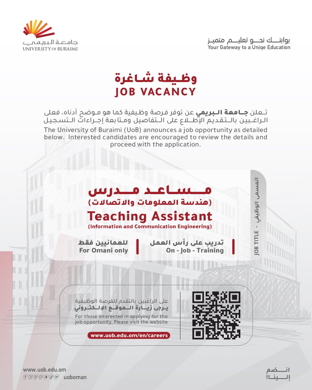 جامعة البريمي تعلن عن توفر وظيفة مساعد مدرس هندسة المعلومات والاتصالات