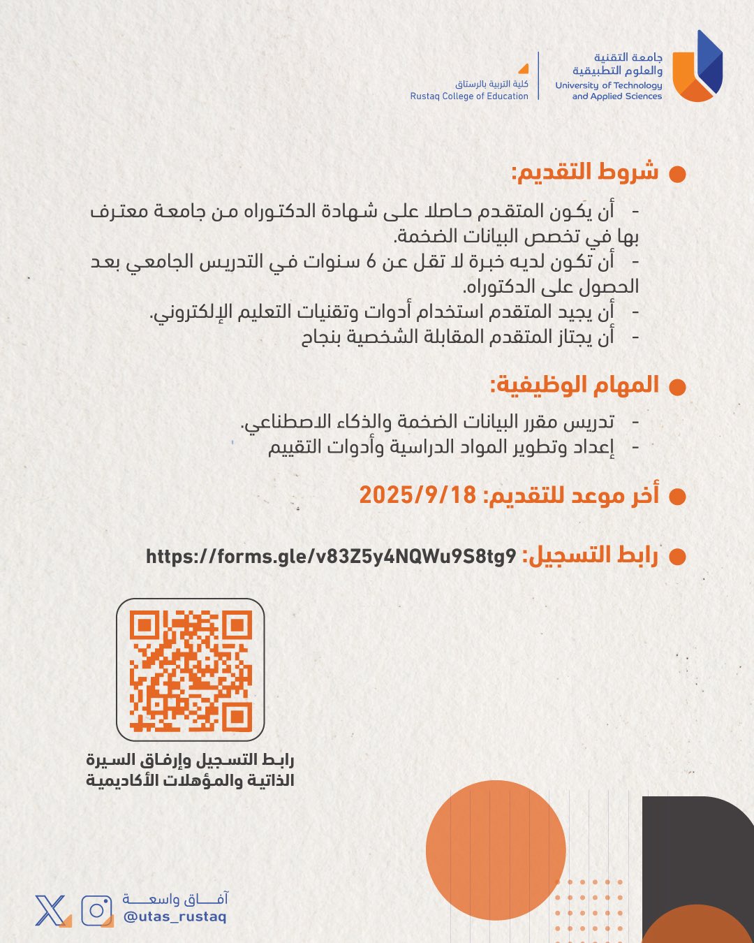 أعلنت جامعة التقنية والعلوم التطبيقية في الرُستاق عن شواغر أكاديمية في تخصص البيانات الضخمة والذكاء الاصطناعي بقسم اللغة الإنجليزية وآدابها بنظام العمل الجزئي وللمزيد من التفاصيل أنقر هنا