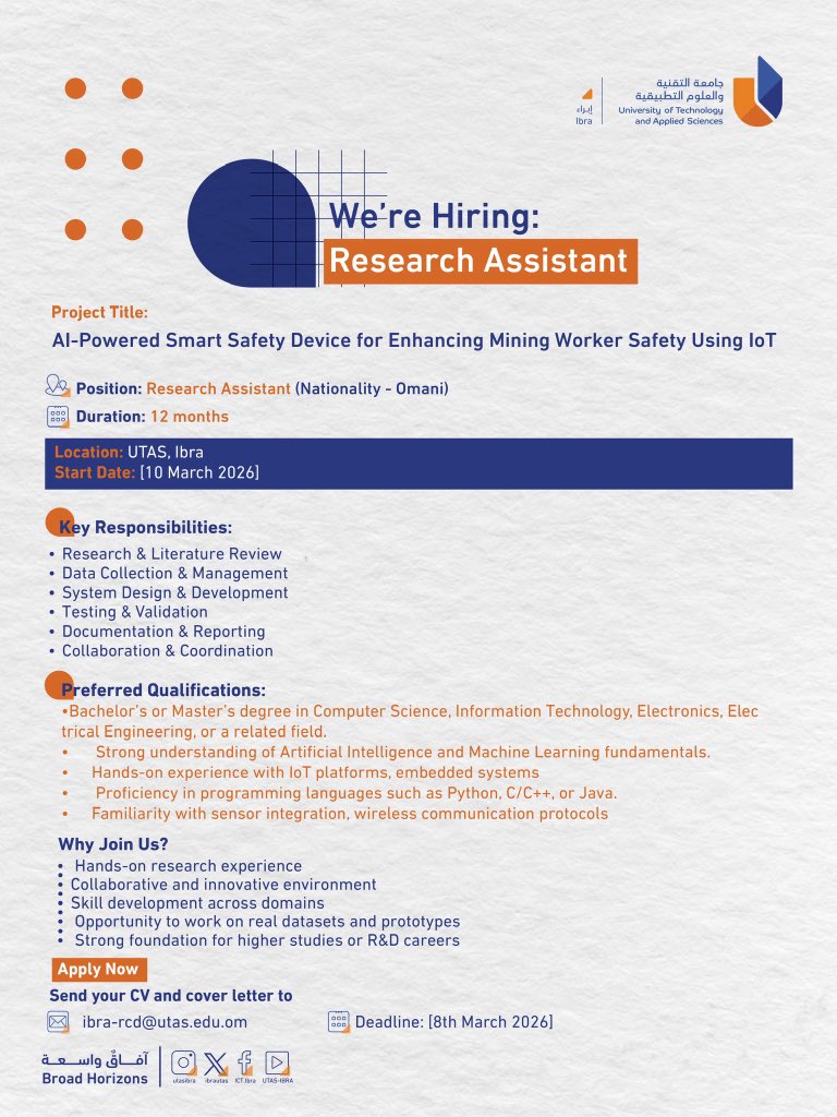 أعلنت جامعة التقنية والعلوم التطبيقية بإبراء عن توفر فرصة عمل بمسمّى مساعد باحث بعقدٍ مؤقت.