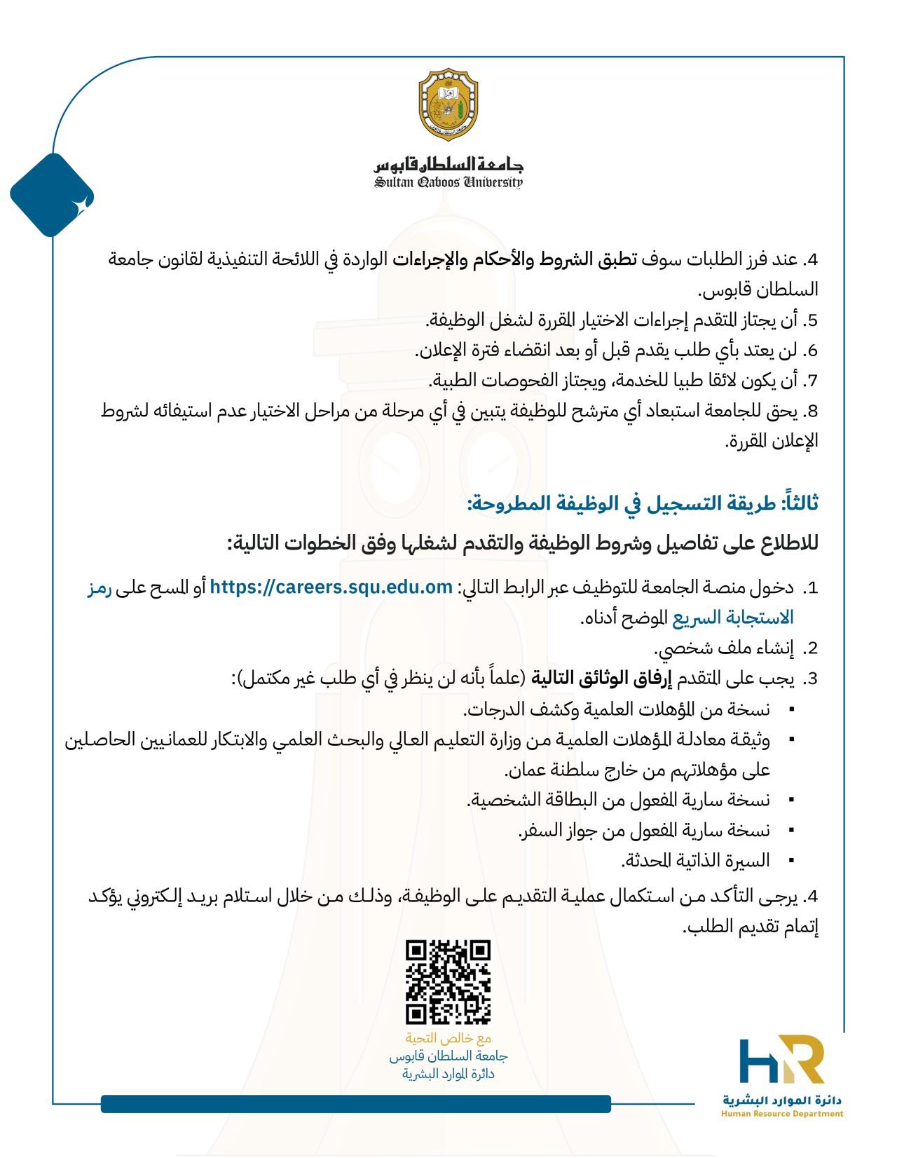 أعلنت جامعة السلطان قابوس عن توفر وظيفة شاغرة باحث في تخصص علم الصخور الصلبة أو الجيوكيمياء أو ما يعادلها، على أن يكون المتقدم حاصلاً على درجة الدكتوراه وللمزيد من التفاصيل والتسجيل أنقر هنا