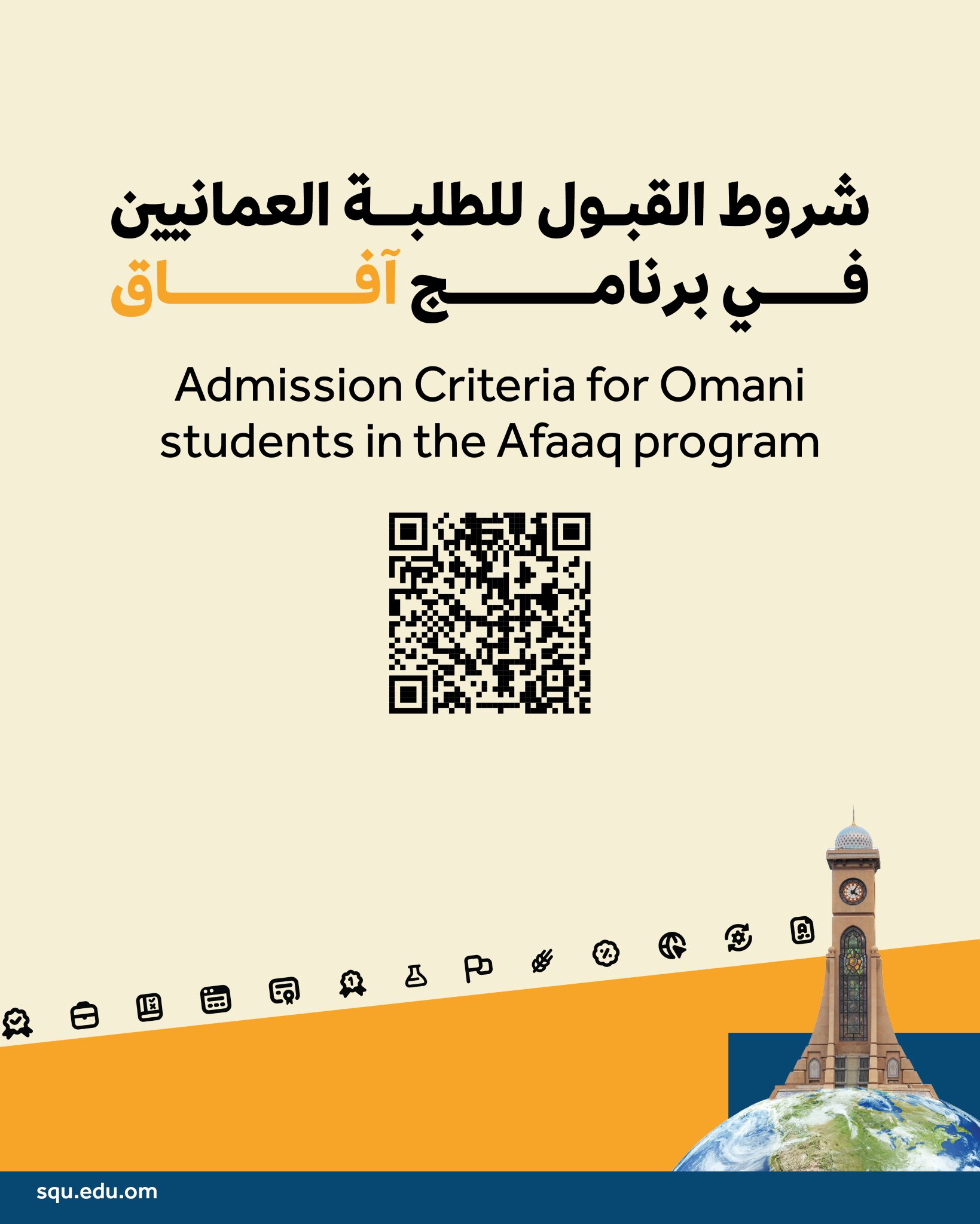 أعلنت جامعة السلطان قابوس عن فتح باب التسجيل في برنامج (آفاق) للطلبة العُمانيين وللمزيد من التفاصيل والتسجيل أنقر هنا ولقراءة شروط القبول للطلبة العمانيين أنقر هنا