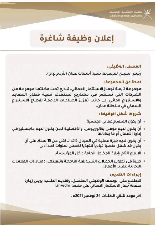 جهاز الاستثمار العماني يعلن عن شاغر وظيفي لديه