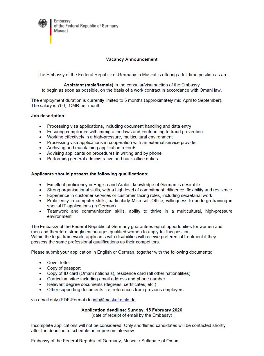 سفارة جمهورية ألمانيا بمسقط تعلن عن وظيفة بقسم التأشيرات والشؤون القنصلية