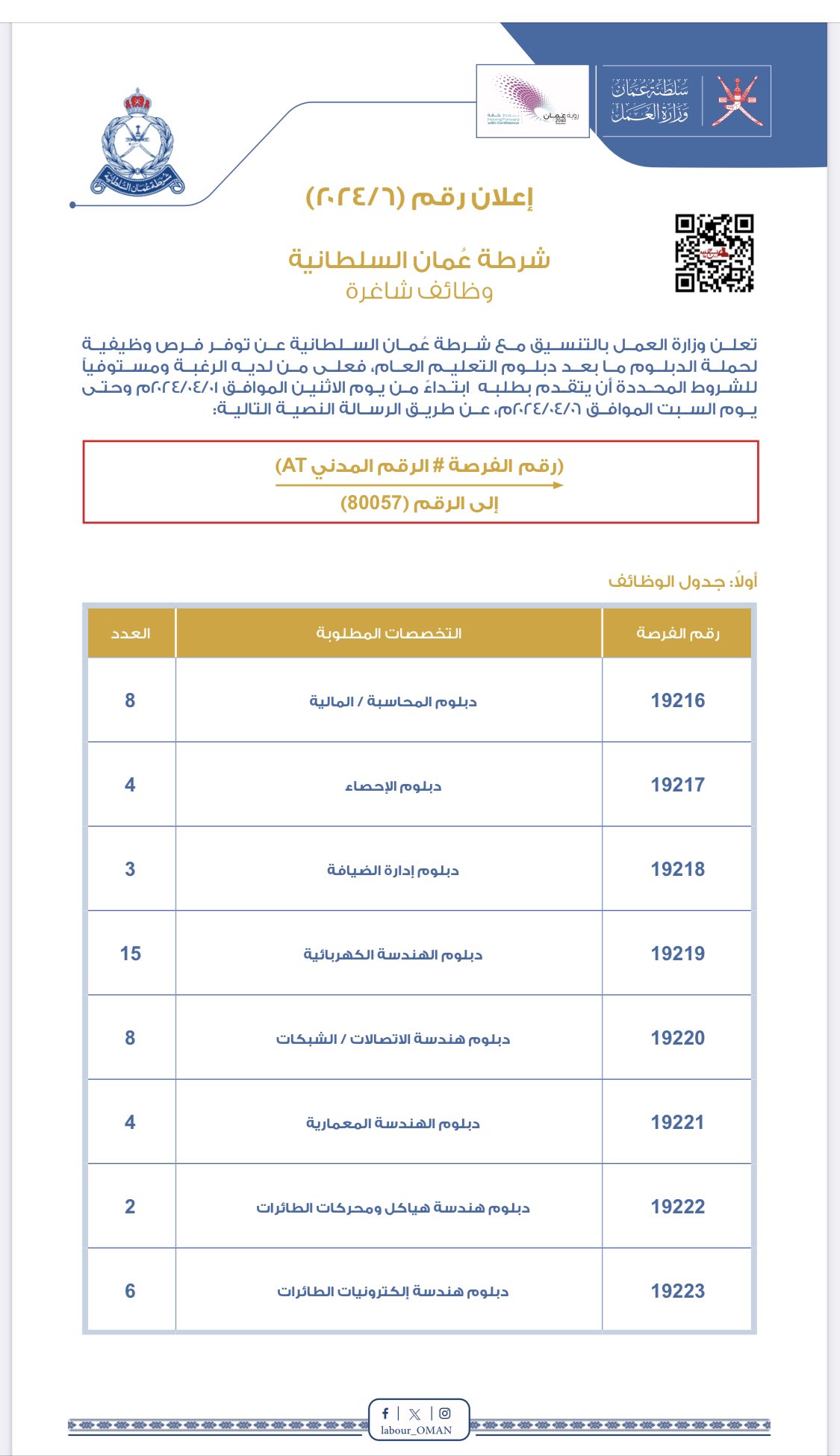 شرطة عمان السلطانية تعلن عن مجموعة من الفرص الوظيفية