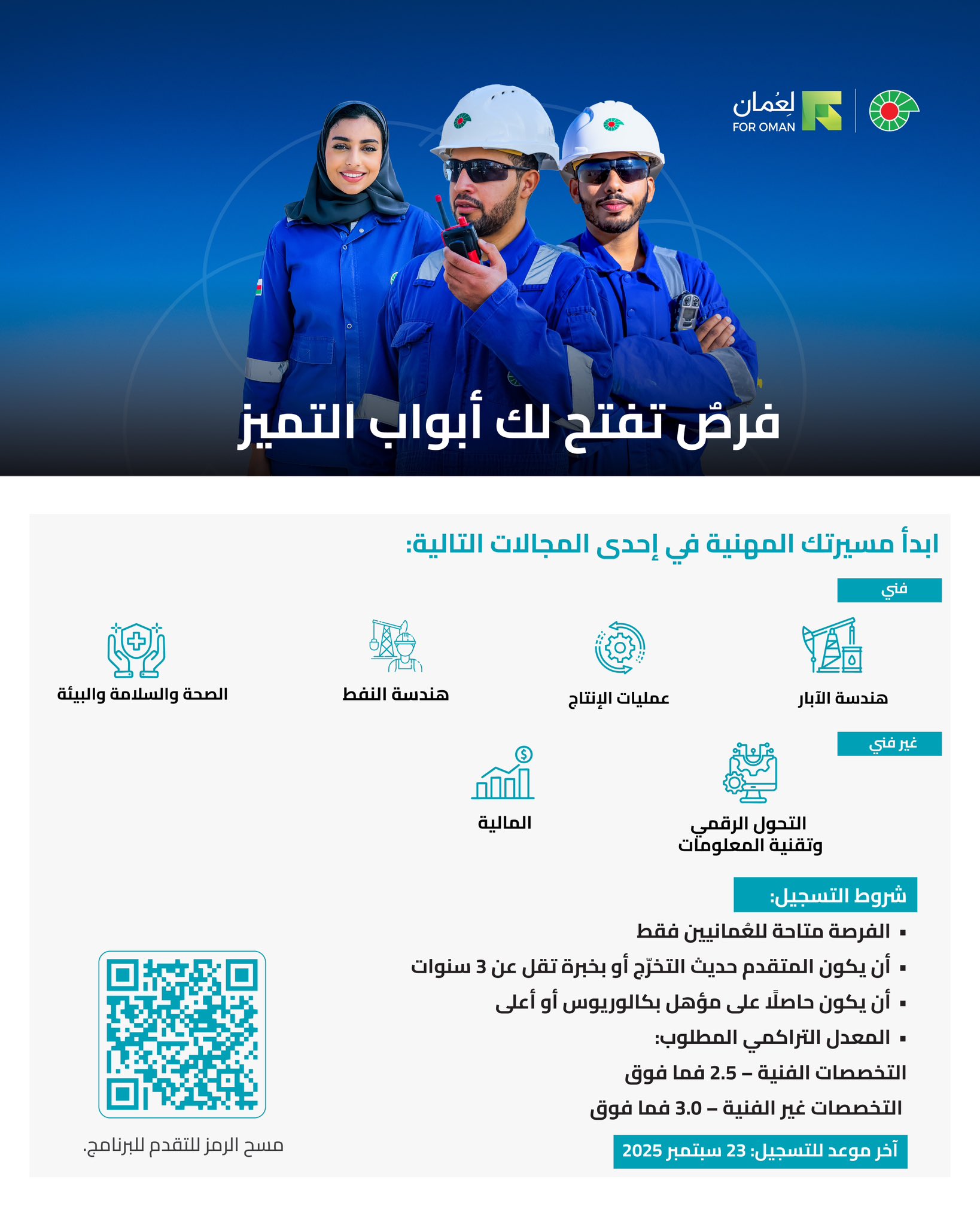 بالتنسيق مع وزارة العمل أعلنت شركة تنمية نفط عمان عن توفر برنامج شبابنا للخريجين ولتقديم الطلب ومعرفة المزيد عن هذه الفرص وغيرها، يرجى زيارة موقع وظائف النفط والغاز أنقر هنا