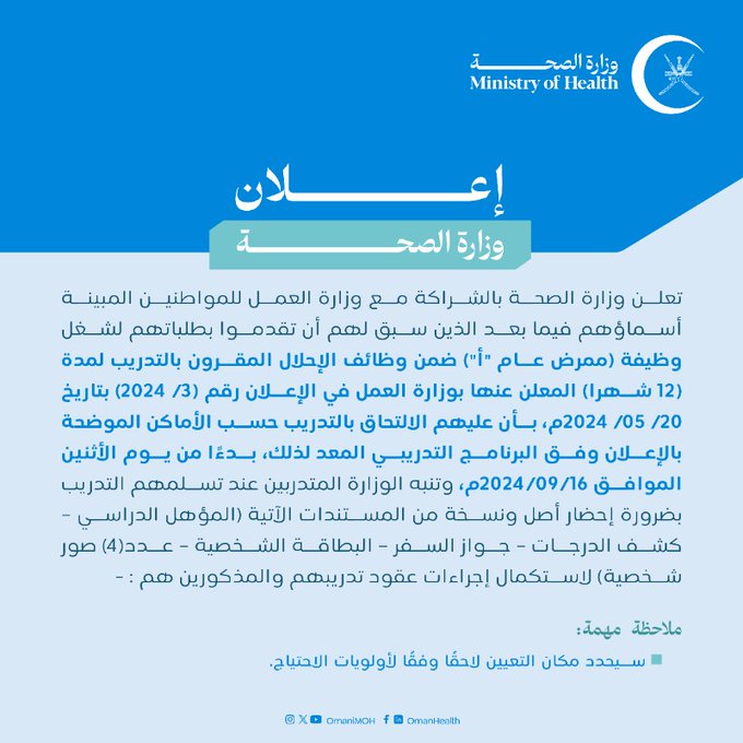 بالشراكة مع وزارة العمل أعلنت وزارة الصحة للمواطنين المبينة أسماؤهم فيما بعد والذين تقدموا لشغل وظيفة (ممرض عام أ )، بأن عليهم الالتحاق بالتدريب يوم الأثنين الموافق 16/09/2024م . وللمزيد من التفاصيل ومشاهدة أسماء المقبولين بجودة عالية أنقر هنا
