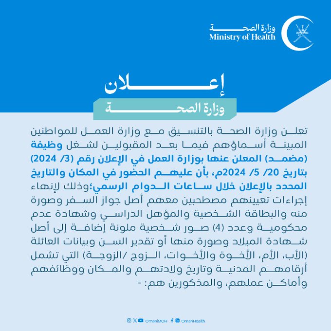 بالشراكةً مع وزارة العمل أعلنت وزارة الصحة للمواطنين المبينة أسماؤهم فيما بعد، الذين تقدموا لشغل وظيفة (مضمد)، بأن عليهم الحضور في الزمان والمكان المحددين وذلك لإنهاء إجراءات تعيينهم. ولمشاهدة أسماء المقبولين بجودة عالية أنقر هنا