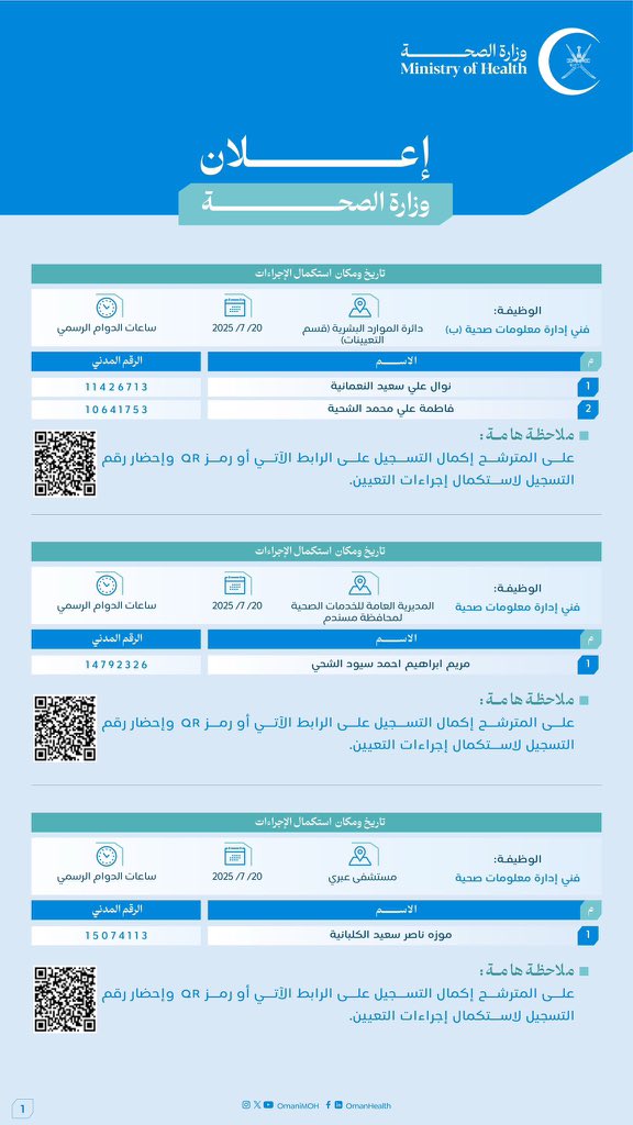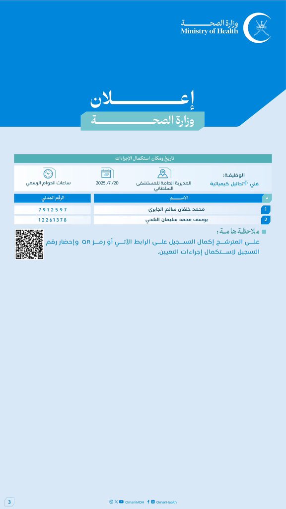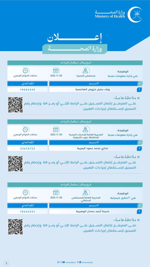 وزارة الصحة تُعلن أسماء المواطنين الذين تقدموا لشغل وظيفة لإنهاء إجراءات تعيينهم