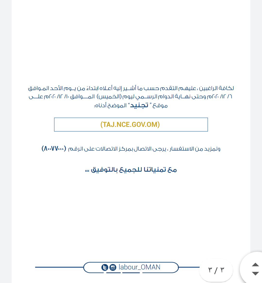 ودعت وزارة العمل الراغبين في التسجيل والاطلاع على الفرص الوظيفية وشروط شغلها إلى زيارة موقع تجنيد: