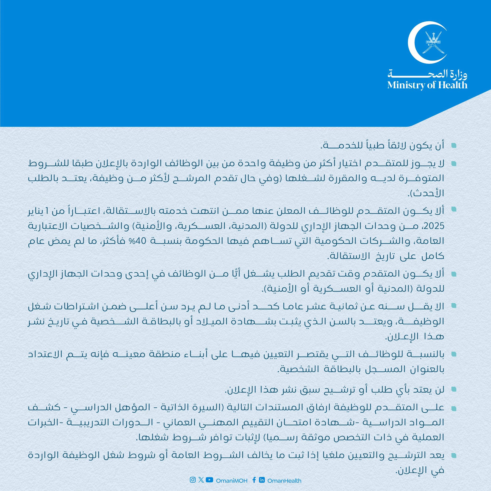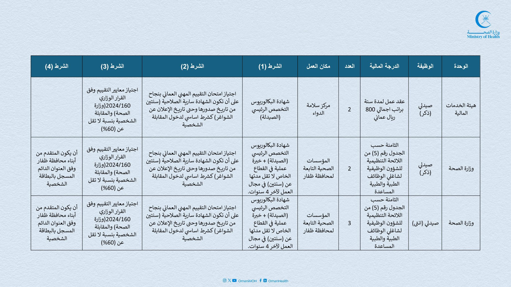أعلنت وزارة الصحة وهيئة الخدمات المالية وبالتنسيق مع وزارة العمل عن توفر عدد مـن الوظائـف وذلك حسـب البيانات المحـددة والشـروط الموضحـة أمـام كل وظيفـة، فعلى من يجد في نفسه الرغبة لشغل أحدى تلك الوظائف ومستوفيا للشروط شغلها أن يتقدم بطلبه عبر رمز (QR) او عبر الرابط التالي أنقر هنا