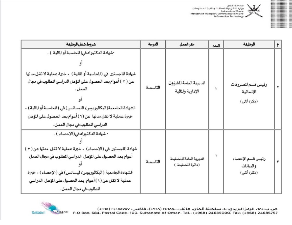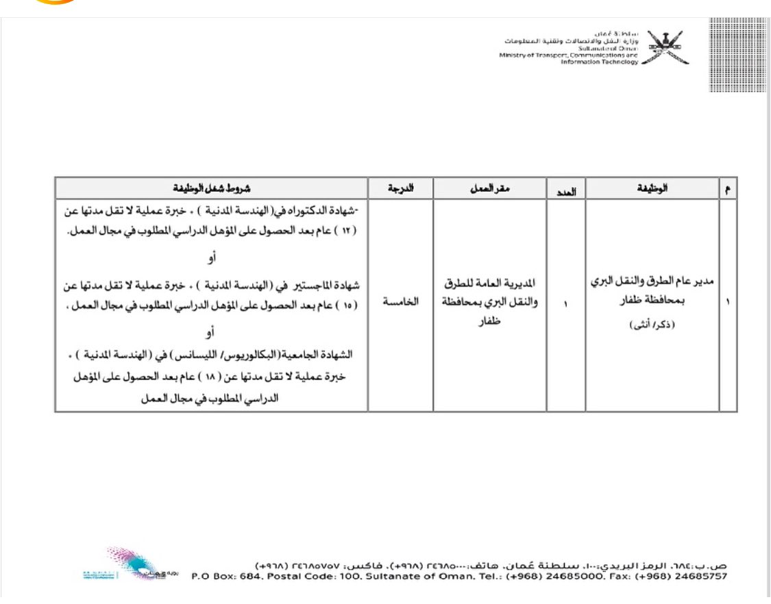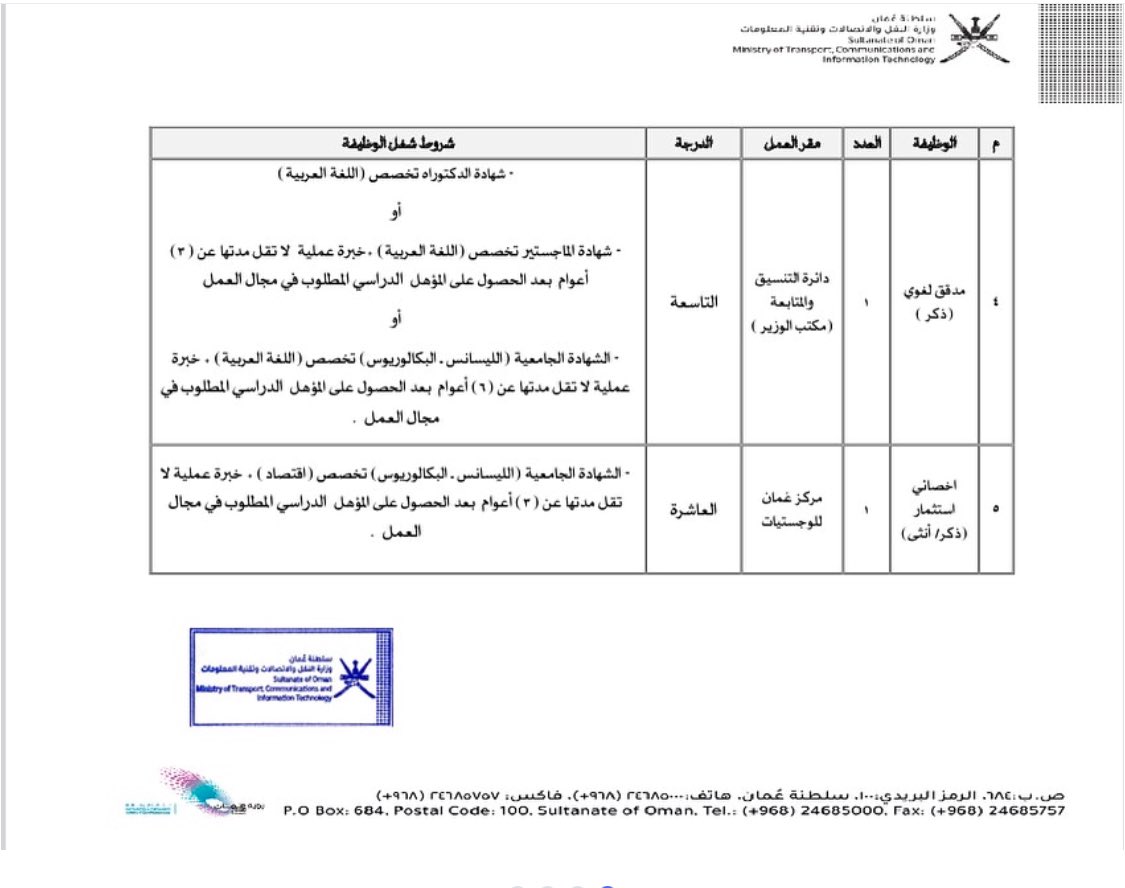 أعلنت وزارة النقل والاتصالات وتقنية المعلومات بالتعاون مع وزارة العمل أن تعلن عن وجود 5 شواغر وظيفية في مختلف تقسيمات الوزارة وللتقديم للشواغر المتاحة أنقر هنا