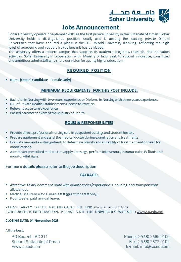 أعلنت جامعة صحار عن توفر وظيفتين شاغرتين للعمانيين – ممرضة – أستاذ مشارك في القانون الجنائي – وللتسجيل أنقر هنا