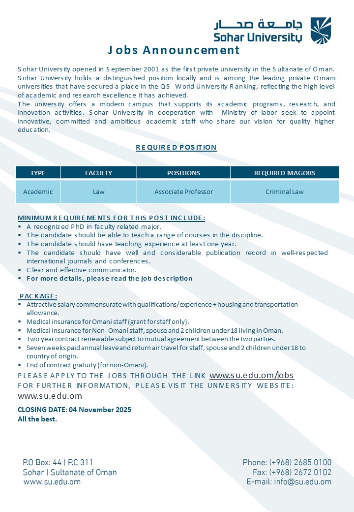 جامعة صحار تعلن عن وظيفتين شاغرتين للعمانيين
