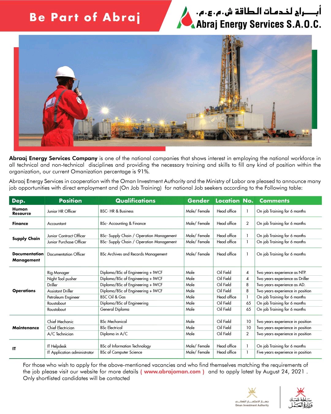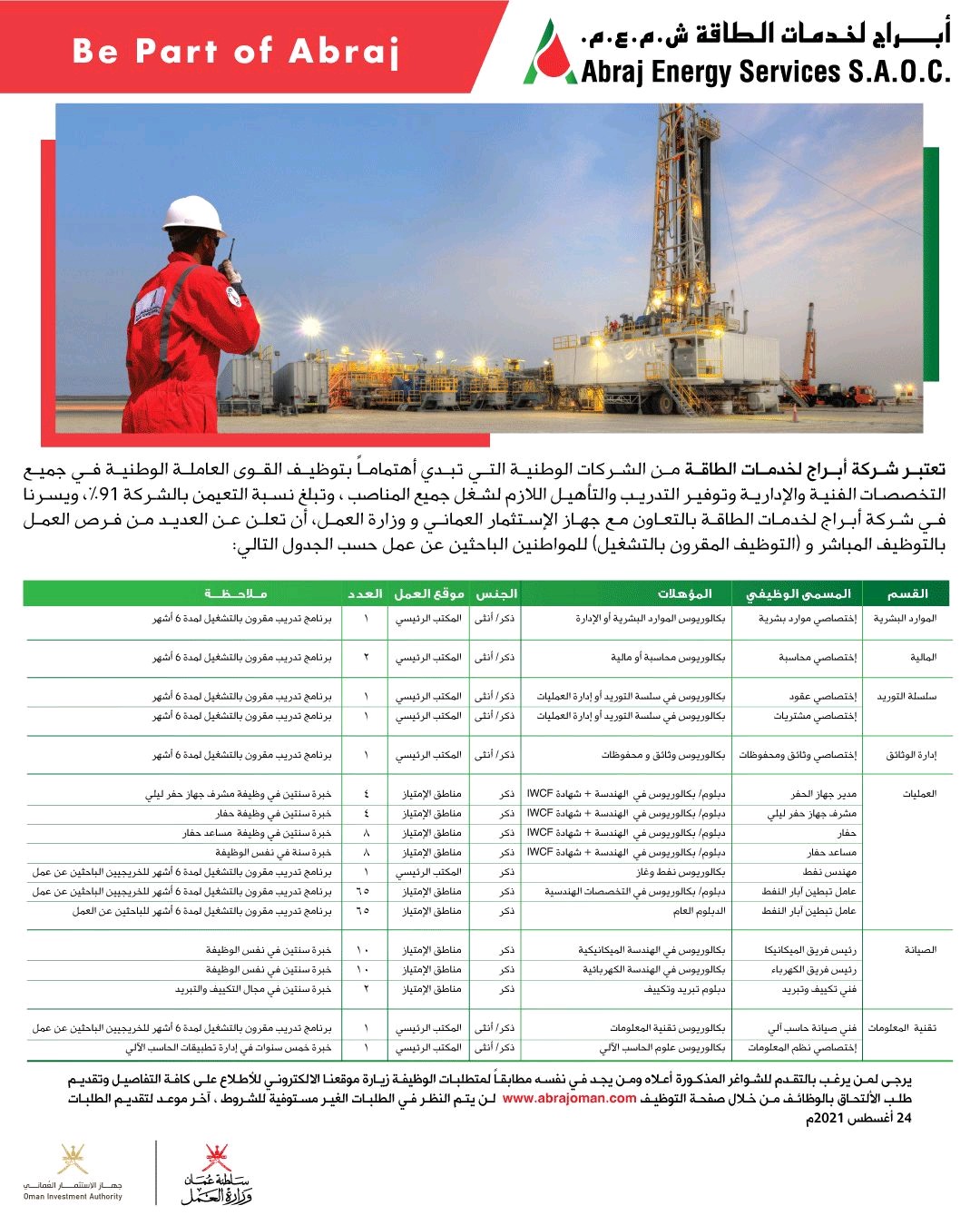 شركة أبراج لخدمات الطاقة وبالتعاون مع جهاز الإستثمار العماني ووزراة العمل تعلن عن توفر فرص وظيفية منها توظيف مباشر ، تدريب مقرون بالتشغيل.