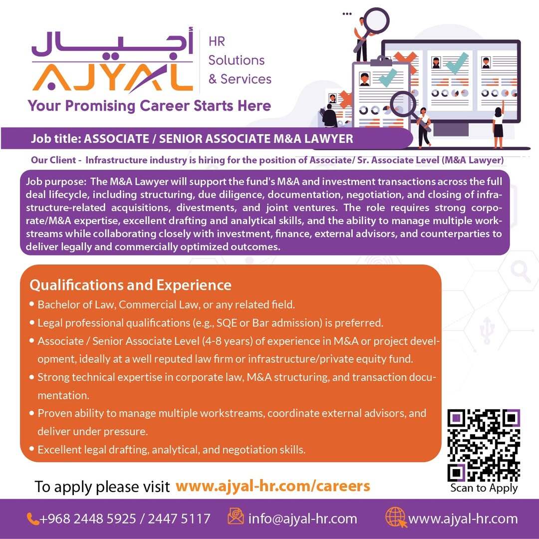 أجيال لحلول الموارد البشرية تعلن عن وظيفة محامي اندماج واستحواذ بدرجة مساعد / مساعد أول