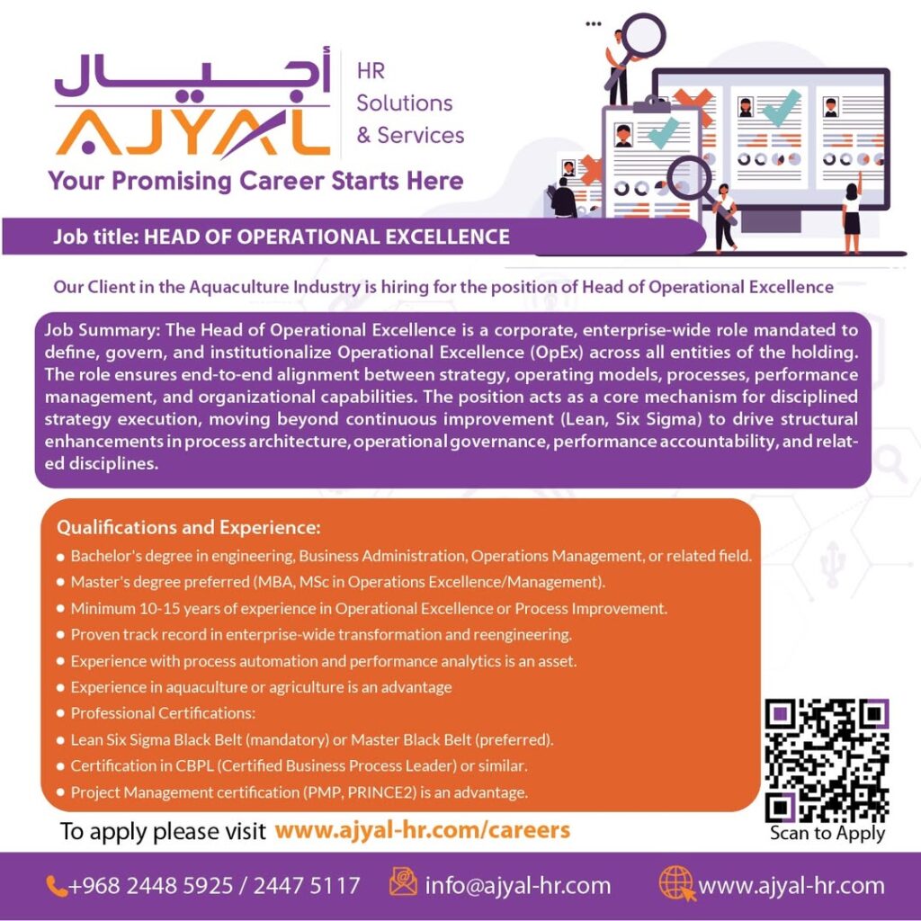 أعلنت شركة أجيال لحلول الموارد البشرية عن توفر شاغر وظيفي لديها – رئيس التميز التشغيلي – في مسقط