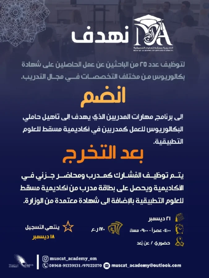 أعلنت أكاديمية مسقط للعلوم التطبيقية عن فرصة لتوظيف  25 مدربًا من حملة البكالوريوس في مختلف التخصصات وتأهيلهم للعمل في مجال التدريب الاحترافي داخل أكاديمية مسقط للعلوم التطبيقية.