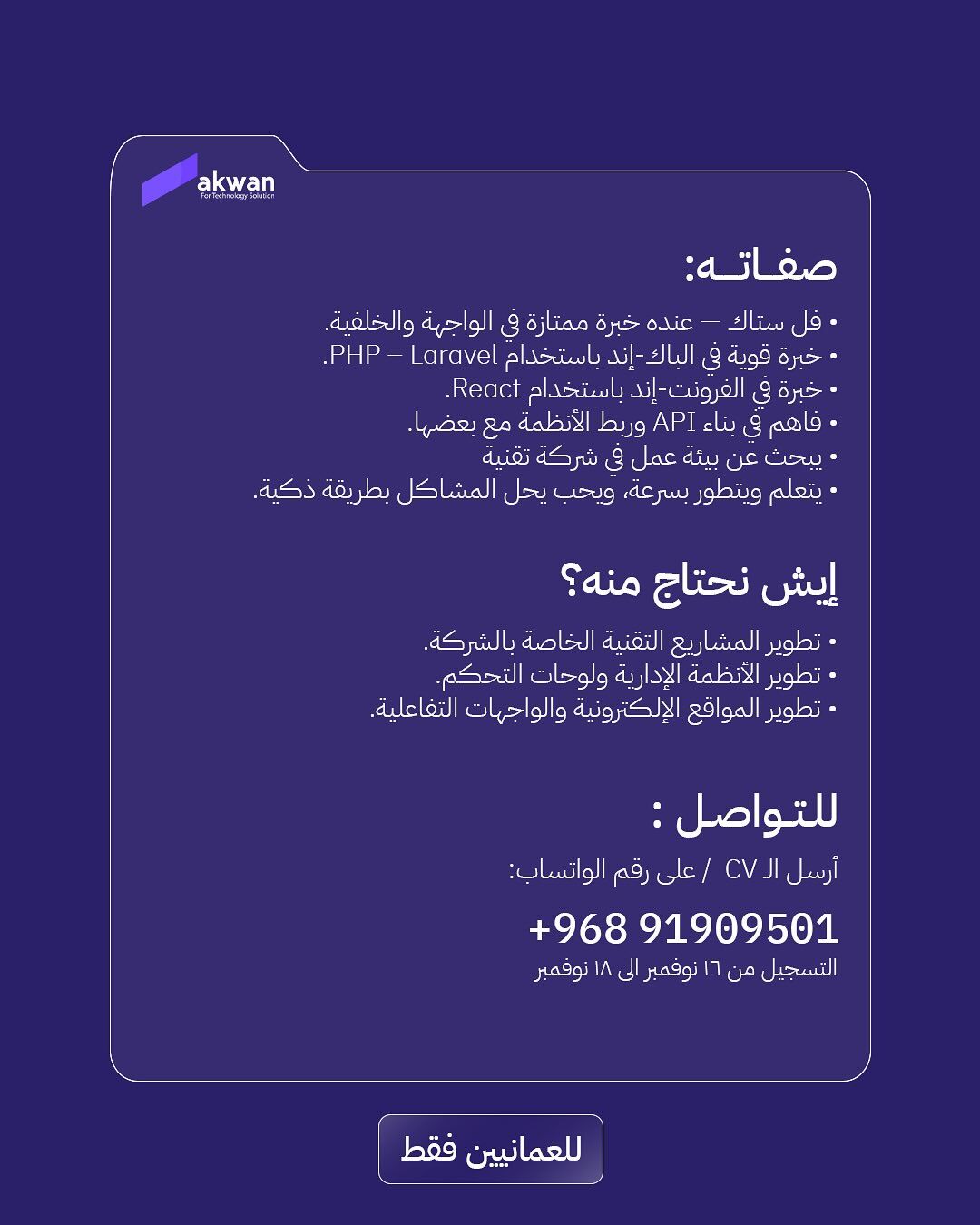 أكوان للحلول التقنية تعلن عن توفر وظيفة مبرمج