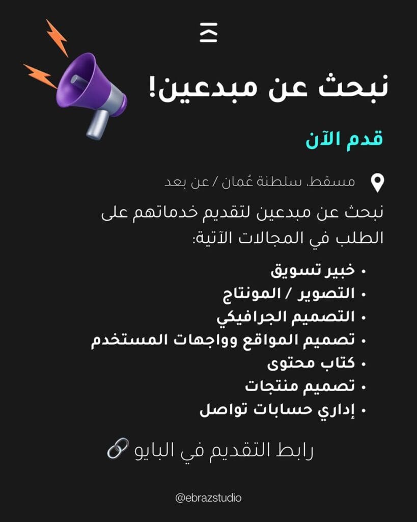 أعلن استوديو ebraz عن توفر 7 شواغر وظيفية في مسقط عن بعد وللمزيد من التفاصيل والتسجيل أنقر هنا