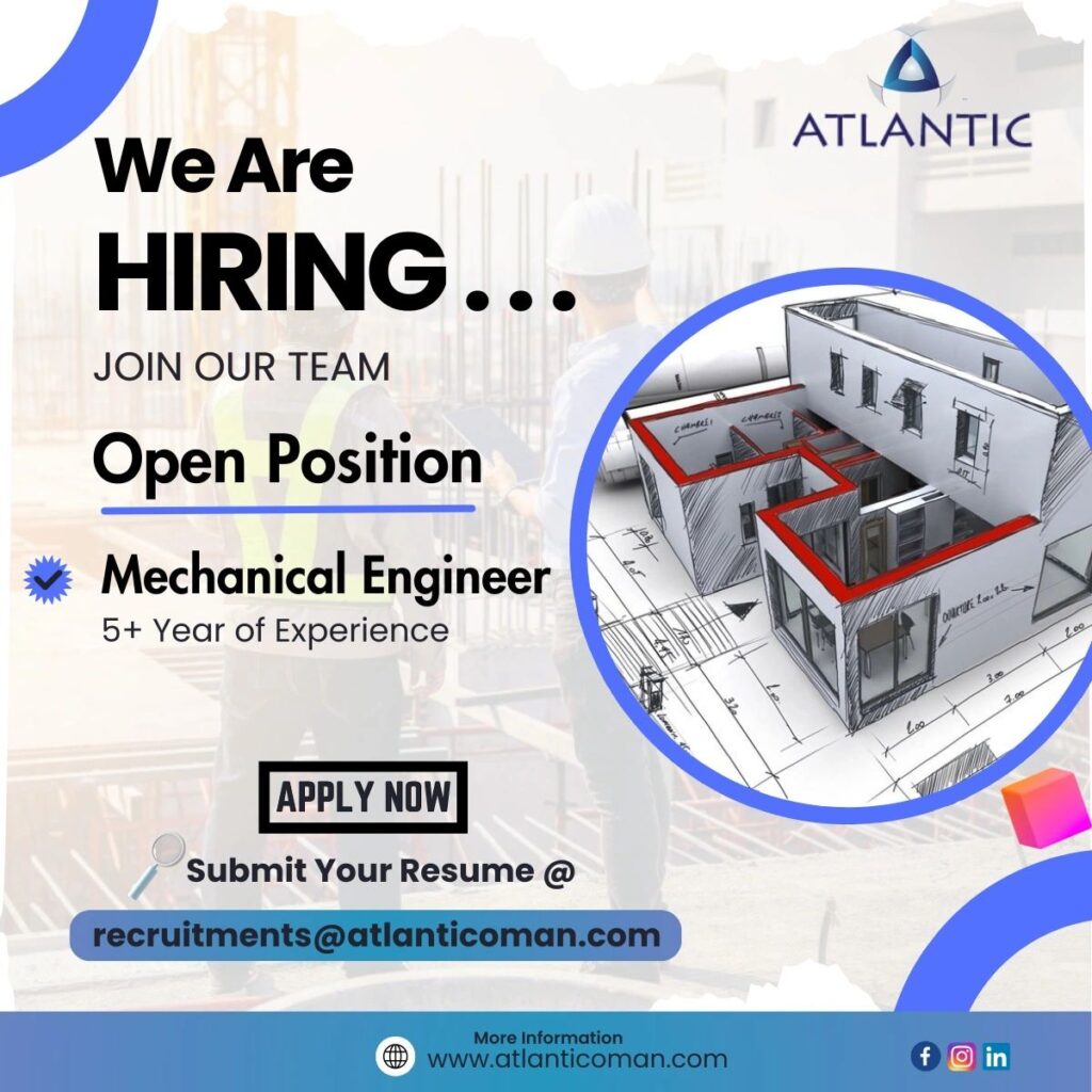 أعلنت شركة الأطلسي للإنشاءات عن توفر شاغر وظيفي عاجل- وظيفة مهندس ميكانيكي – مع خبرة مطلوبة 5 سنوات