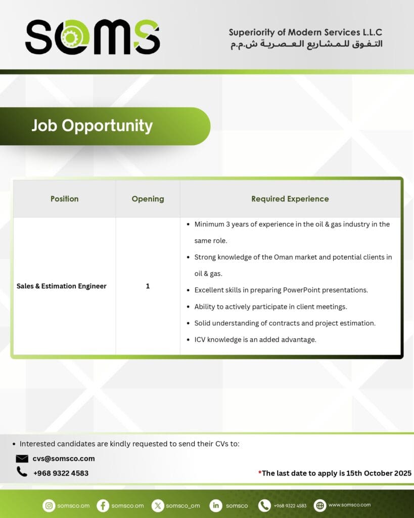 التفوق للمشاريع العصرية تعلن عن وظيفة مهندس المبيعات والتقدير