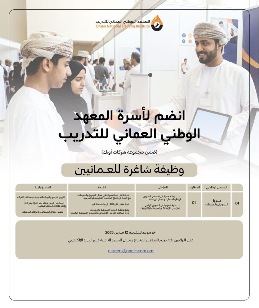 أعلن المعهد الوطني العماني للتدريب ضمن مجموعة شركات أونك عن توفر شاغرة وظيفي للعمانيين – مسؤول التسويق والمبيعات –