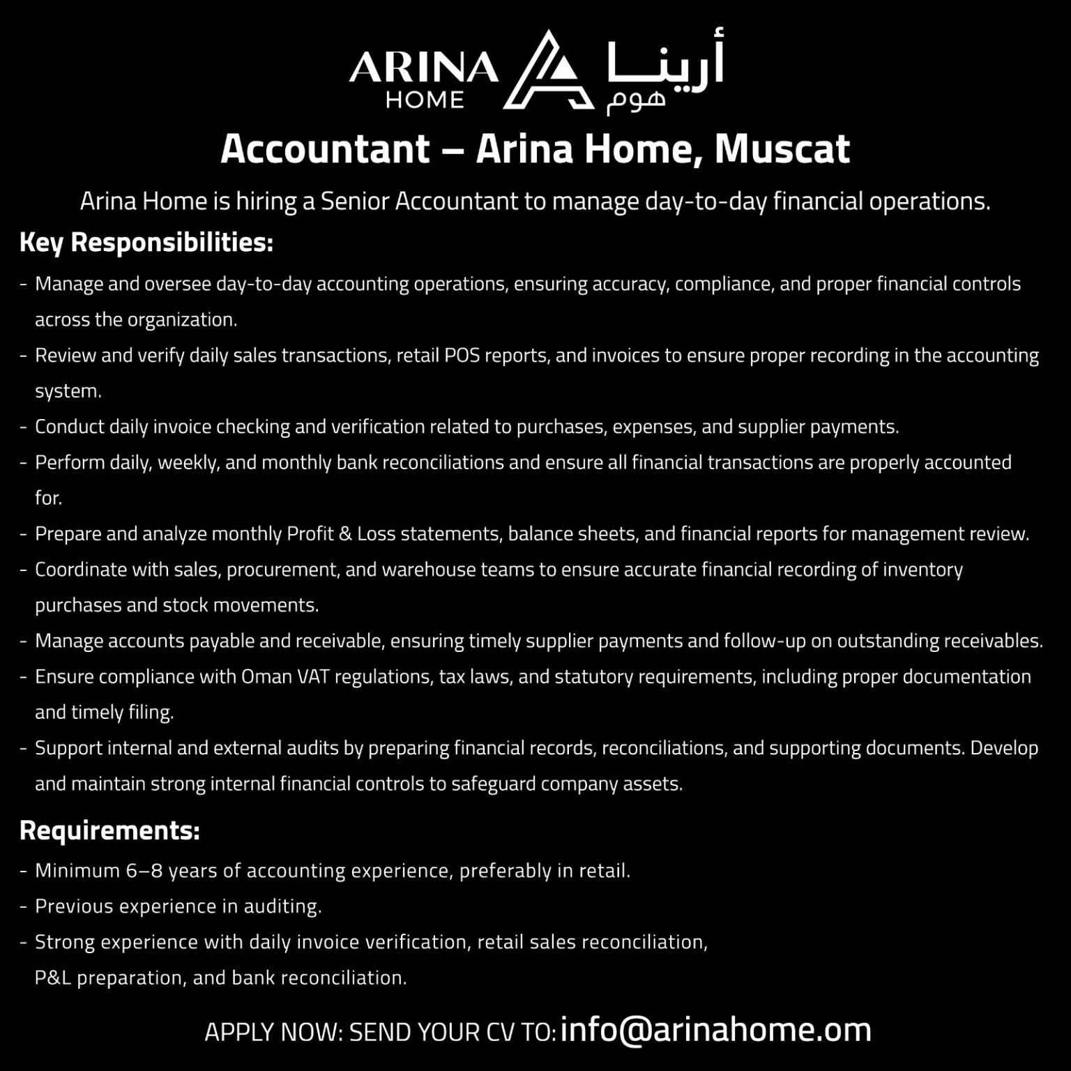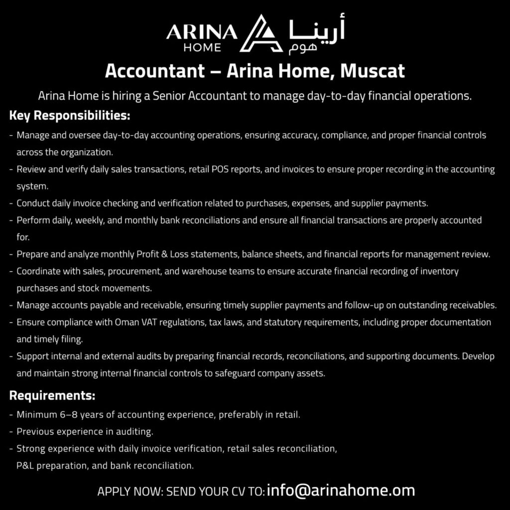 أعلنت شركة أرينا هوم عن توفر وظيفية شاغرة لديها في محافظة مسقط – محاسب –