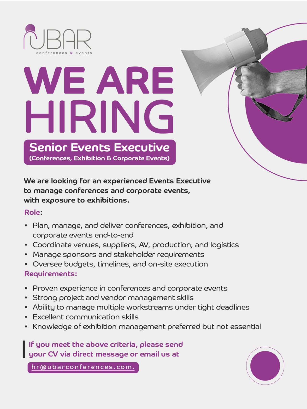 وأضافت الشركة بأنها تبحث عن مدير تنفيذي متمرس في مجال الفعاليات لإدارة المؤتمرات والفعاليات المؤسسية، مع خبرة في المعارض.