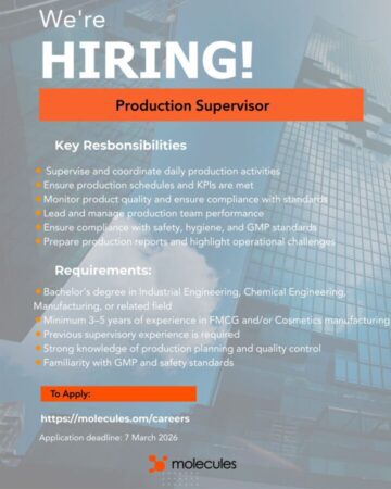 شركة الجزيئات Molecules تعلن عن وظيفة مشرف الإنتاج