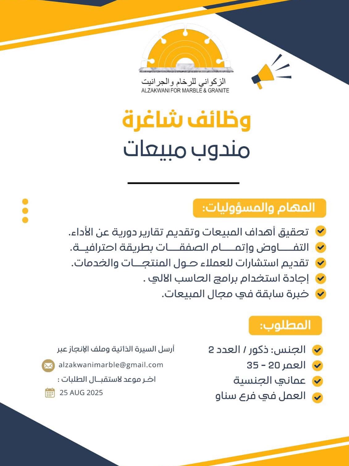 شركة الزكواني للرخام والجرانيت تعلن عن وظيفة مندوب مبيعات