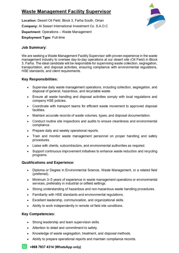 شركة السواري الدولية للاستثمار تعلن عن وظيفة مدير مشرف إدارة النفايات