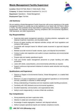 شركة السواري الدولية للاستثمار تعلن عن وظيفة مدير مشرف إدارة النفايات