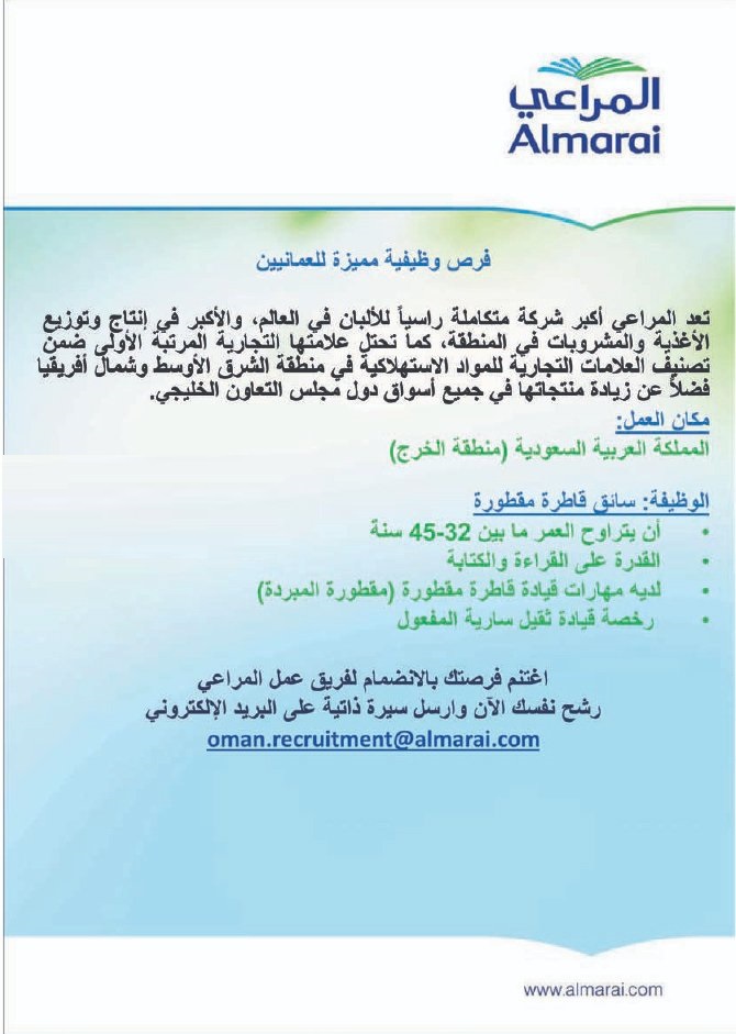 شركة المراعي تعلن عن فرص وظيفية للعمانيين (سائق ثقيل)