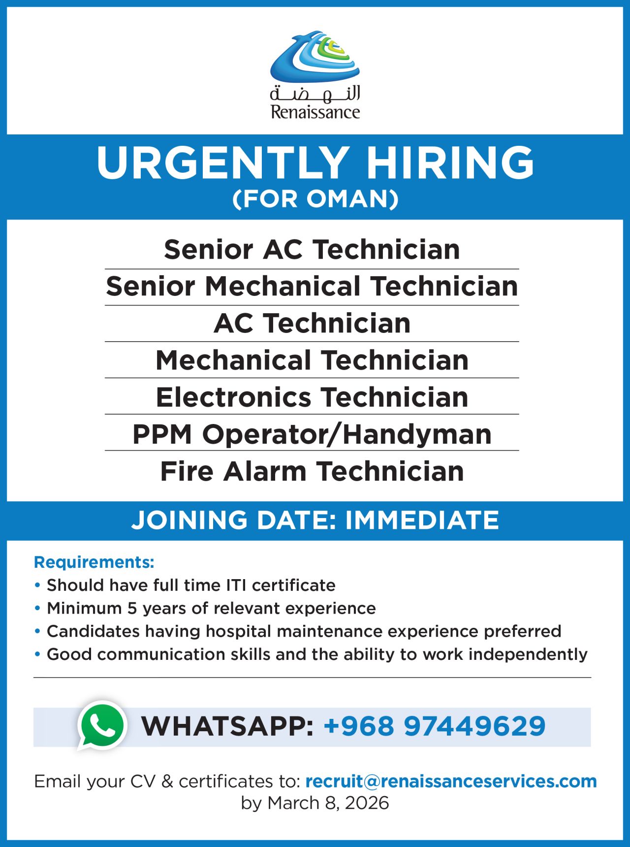 أرسل سيرتك الذاتية وشهاداتك إلى: recruit@renaissanceservices.com قبل 8 مارس 2026