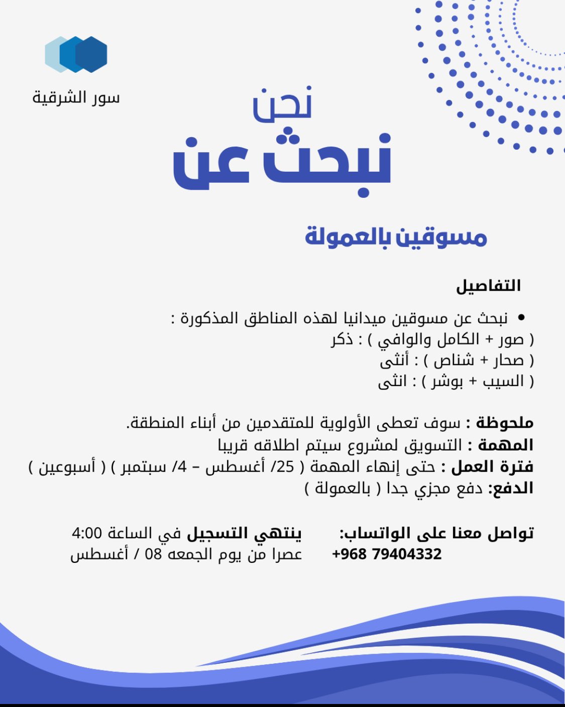 شركة سور الشرقية تعلن عن توفر فرص عمل