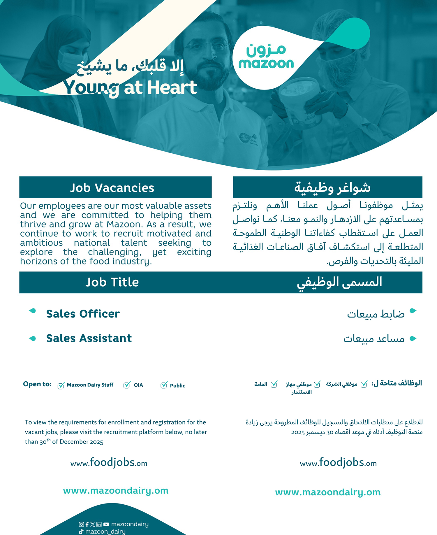 شركة مزون للألبان تعلن عن توفر وظيفتين شاغرتين في مجال المبيعات