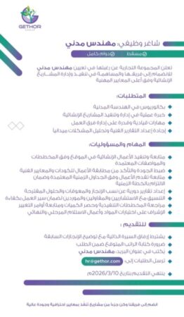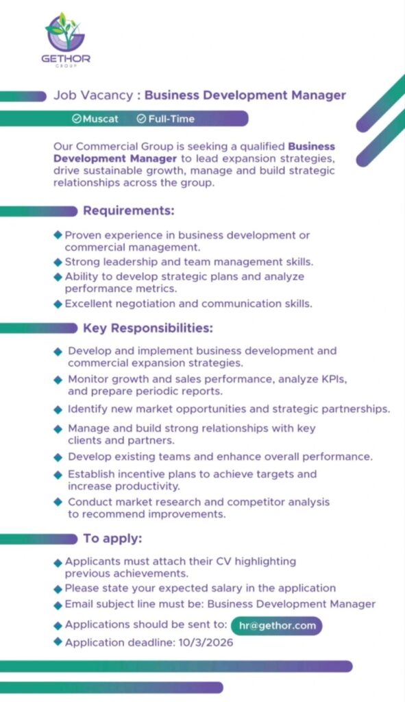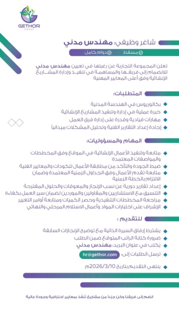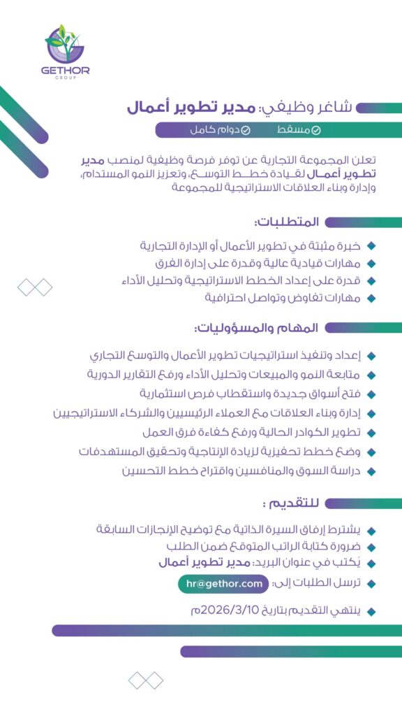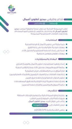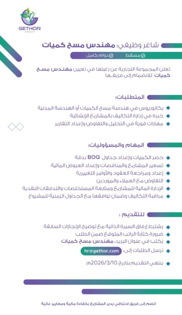ترسل الطلبات إلى الإيميل hr@gethor.com