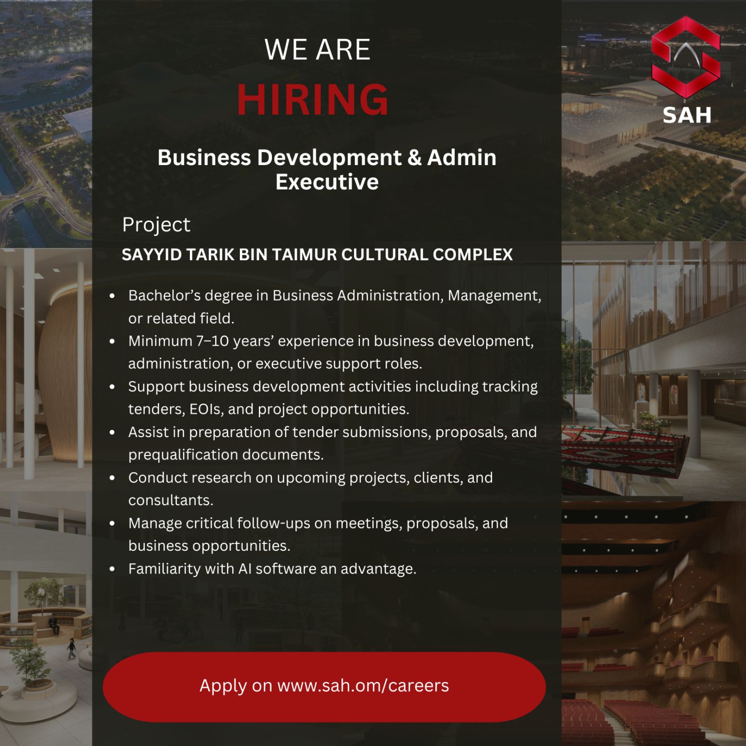 أعلنت مجموعة شركات سيف الحراصي عن توفر وظيفة مسؤول تطوير الأعمال والإدارة في مشروع مجمع السيد طارق بن تيمور الثقافي