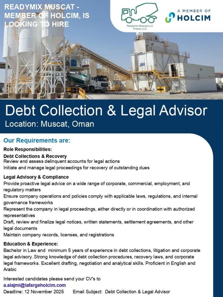 مسقط للخرسانة الجاهزة والبريمكس تعلن عن وظيفة تحصيل الديون والاستشارات القانونية