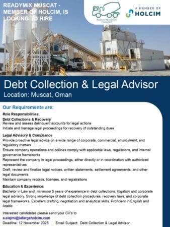 مسقط للخرسانة الجاهزة والبريمكس تعلن عن وظيفة تحصيل الديون والاستشارات القانونية