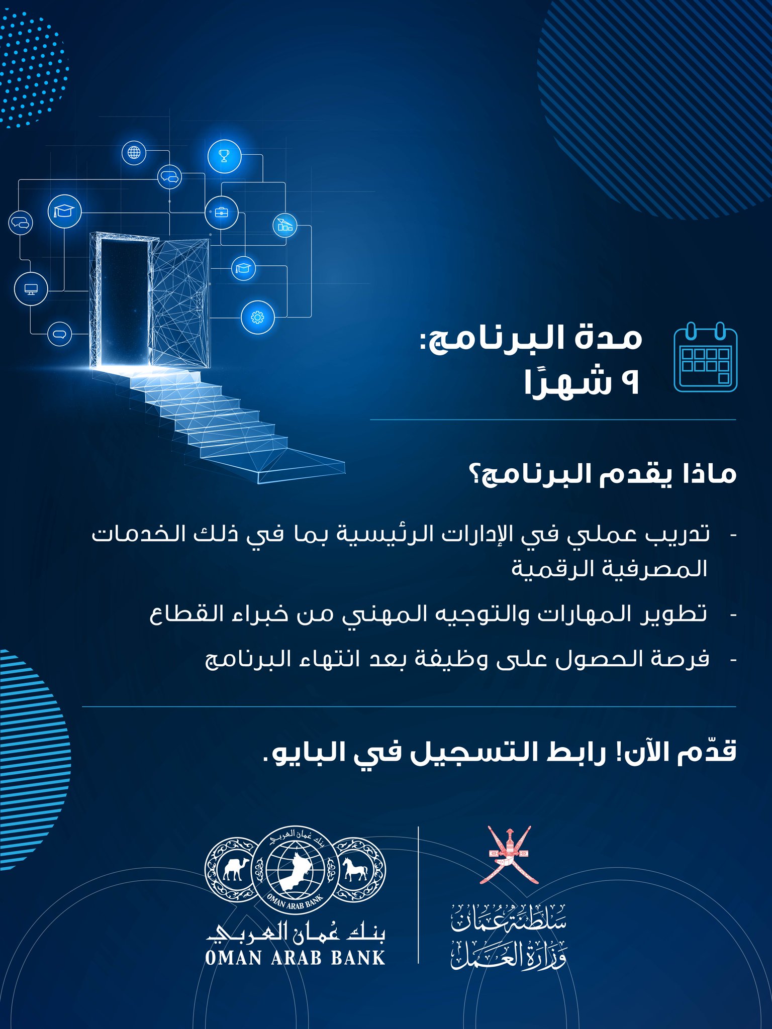أعلن بنك عُمان العربي عن فتح باب التسجيل في برنامج رواد العربي للخريجين والباحثين عن عمل المقرون بالتوظيف الذي تم إطلاقه في عام 2023، والذي يوفر للشباب العماني تجربة مهنية قيمة وهو برنامج تطوير يمتد لمدة 9 اشهر مصمم لإعداد الخريجين من خلال المشاركة في مشاريع عملية، والاستفادة من التوجيه المهني، وتنمية المهارات التي تعزز من مسارهم الوظيفي المستقبلي.