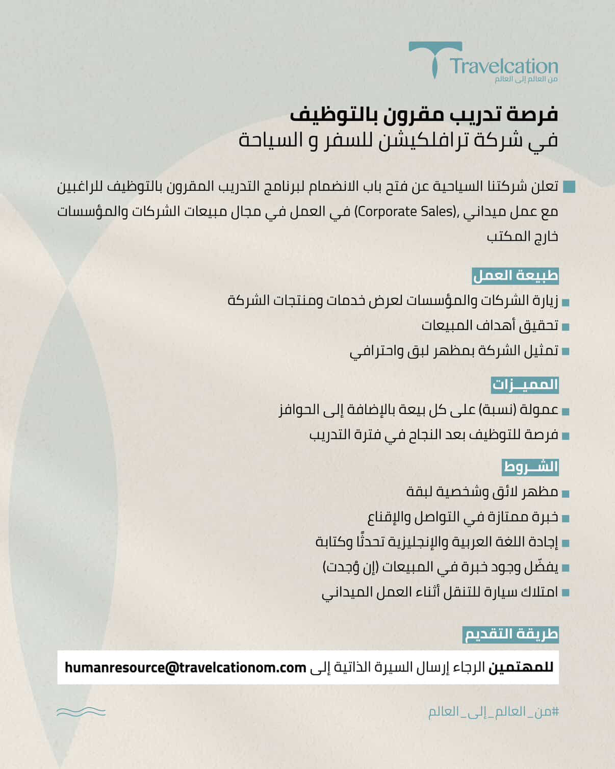 شركة ترافلكيشن للسفر والسياحة تعلن عن فرصة تدريب مقرون بالتوظيف