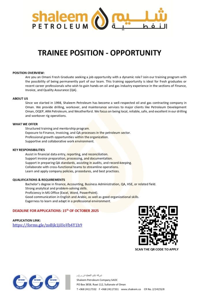 أعلنت شركة شليم النفطية تعلن عن فرصة تدريب للخريجين العمانيين حديثي التخرج في البرنامجالتدريبي هذه الفرصة التدريبية مثالية للخريجين الجدد أو المهنيين الجدد الراغبين في اكتساب خبرة عملية في قطاع النفط والغاز في أقسام المالية والفواتير وضمان الجودة. آخر موعد للتقديم: 15 أكتوبر 2025 وللتفاصيل والتسجيل أنقر هنا