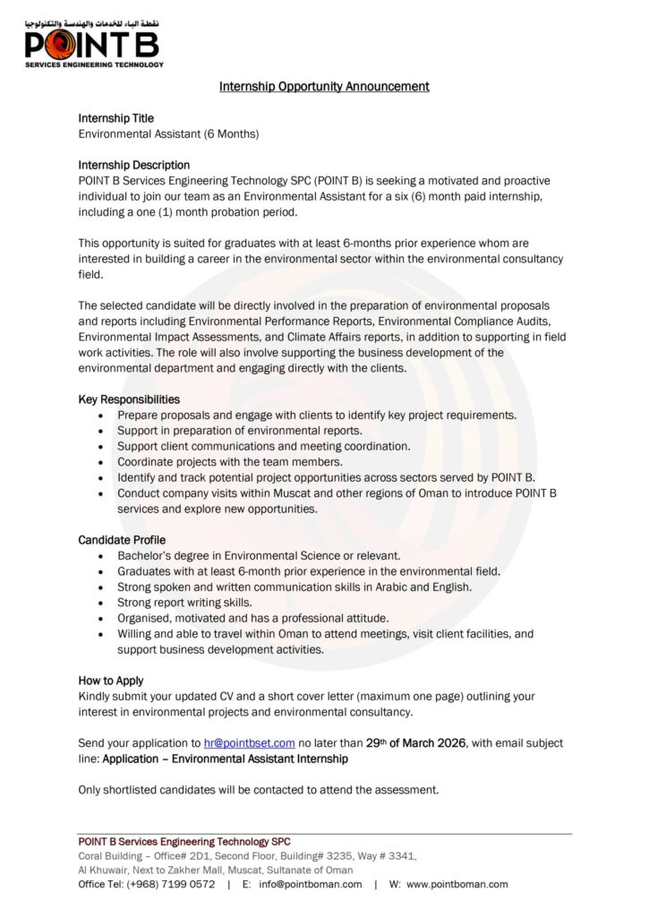 أعلنت شركة POINT B للخدمات والهندسة والتكنولوجيا عن توفر فرصة تدريب لمدة ستة أشهر لوظيفة مساعد بيئي للانضمام إلى فريقها