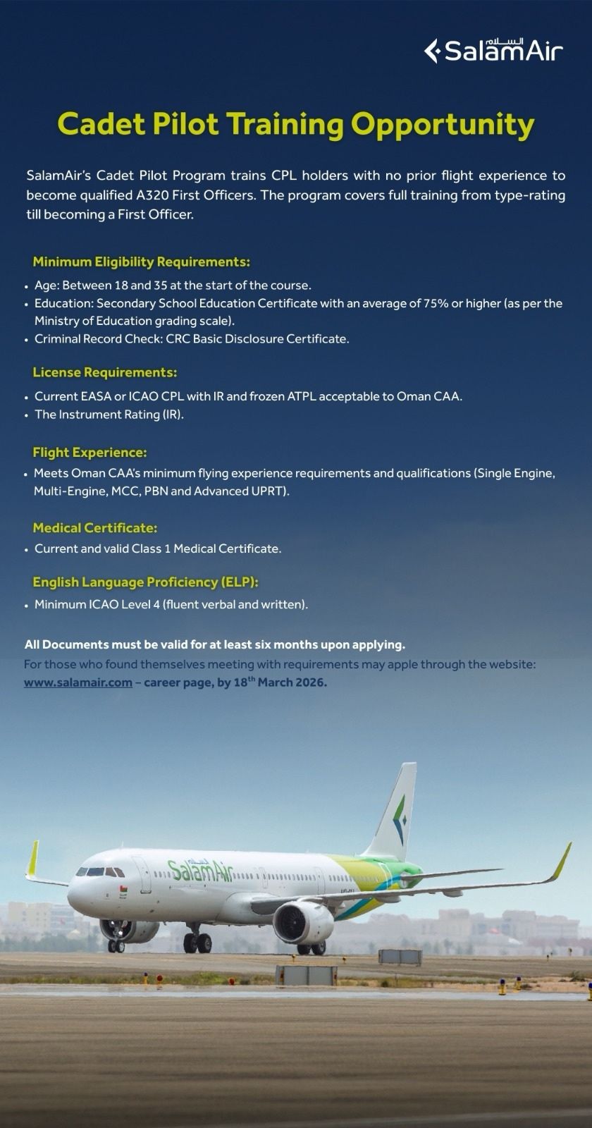 رخصة طيار تجاري سارية المفعول صادرة عن وكالة سلامة الطيران الأوروبية (EASA) أو منظمة الطيران المدني الدولي (ICAO) مع تصنيف الطيران الآلي (IR)، ورخصة طيار نقل جوي مجمدة مقبولة لدى هيئة الطيران المدني العمانية.