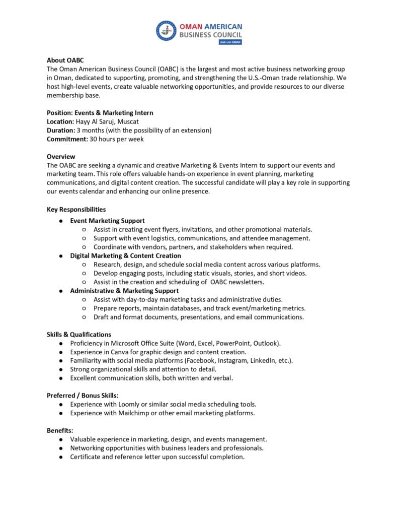 أعلن مجلس الأعمال العماني الأمريكي يعلن عن فرصتين تدريبيتين في مسقط وللتسجيل قدّم طلبك الآن وأرسل سيرتك الذاتية إلى info@oabc.org