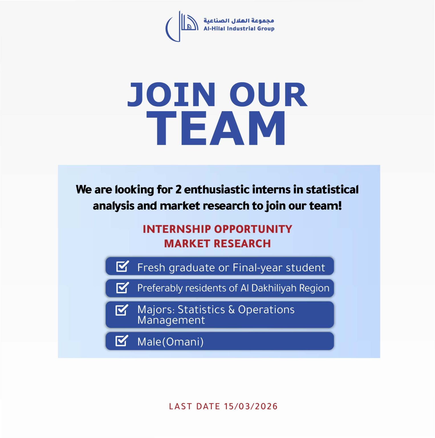 أعلنت مجموعة الهلال الصناعية عن توفر فرصة تدريب للخريجين الجدد وبأنها تبحث عن متدربين متحمسين اثنين في مجال التحليل الإحصائي وأبحاث السوق للانضمام إلى فريقها